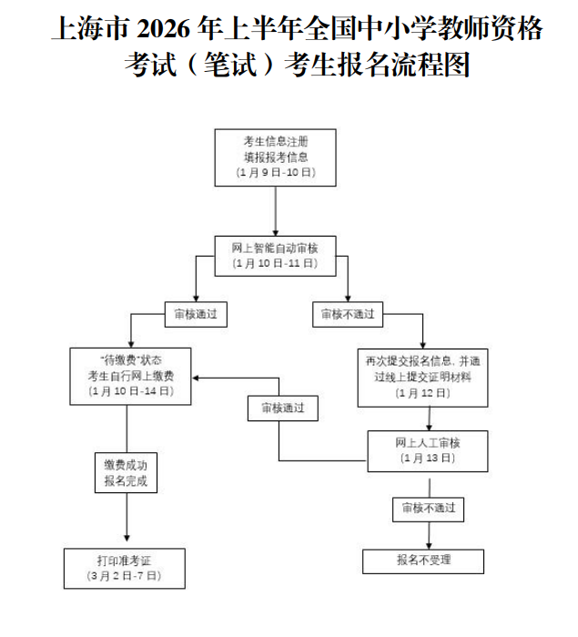 我校全日制在校学生网上报名时选择考区必须为华东师范大学(在校生)考区,中小学教师资格考试实行网上报名,报名步骤分为报考信息输入、报名信息审核和网上缴费三个阶段,具体操作流程见2026年上半年中小学教师资格考试(笔试)上海考区考生报名流程图。从2023年上半年开始进行智能自动审核,请考生关注自己的审核状态,仔细阅读审核不通过的操作要求。(港澳台考生请务必注意1月12日提交相关证明材料)