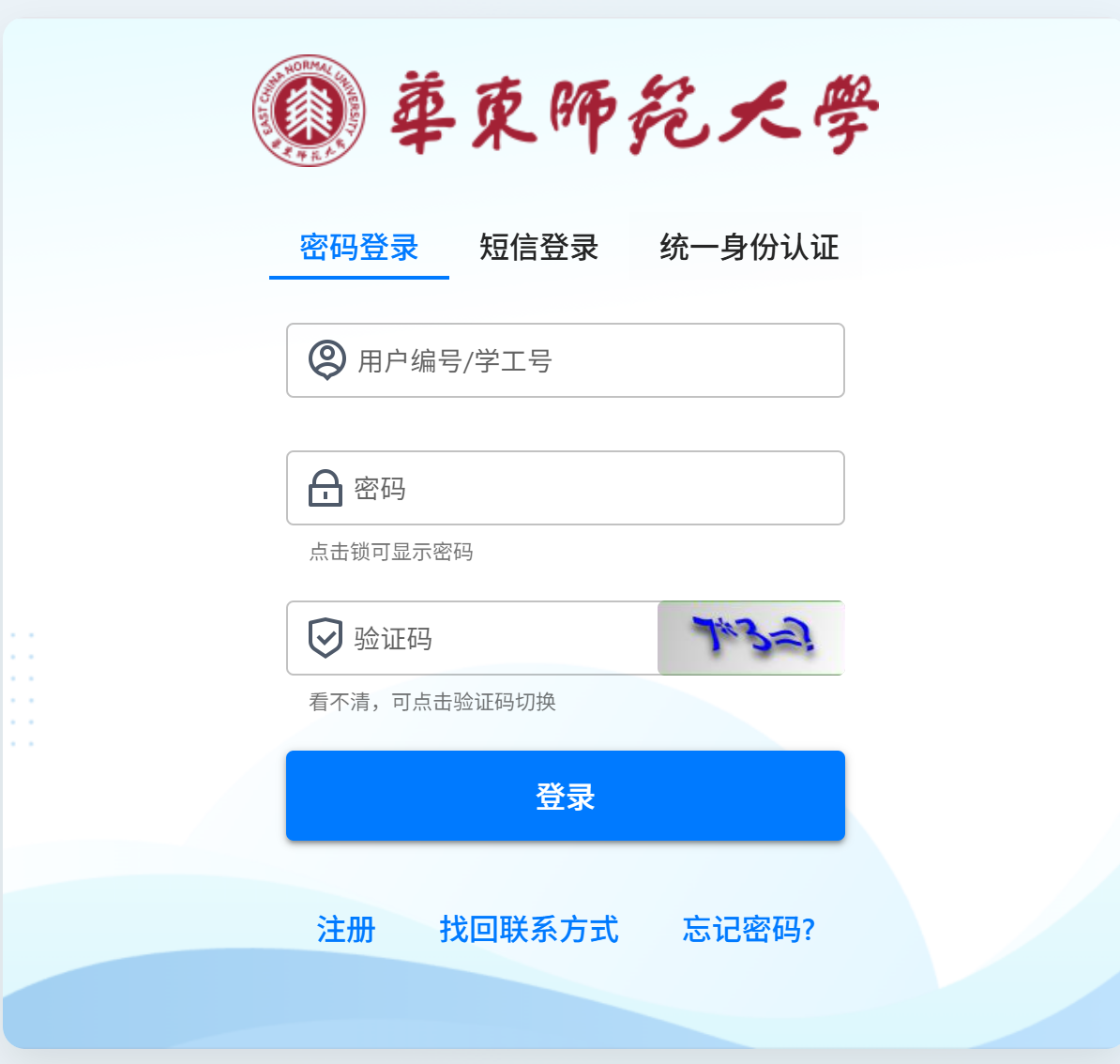 密码登录 | 公共数据库密码 | 用户编号/学工号:主修学号;初始密码:主修学号@ecnu(已修改过的学生使用修改后密码) |