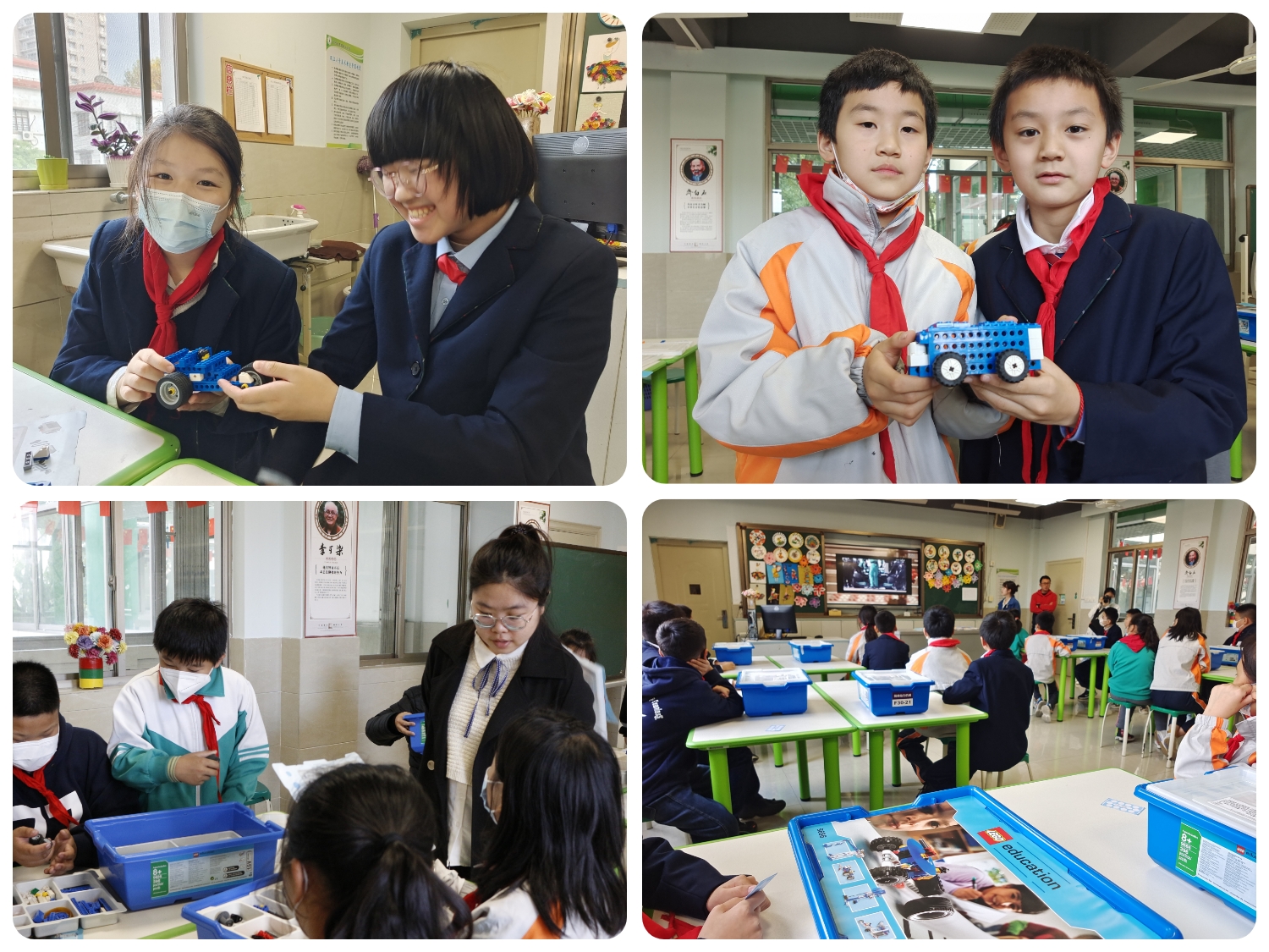 在乐高STEM实验中,5位参加了乐高STEM实训营的师范生带领孩子们体验了乐高STEM课程。孩子们以2-4人为一小组,在认真观看了赛车的介绍视频后,发挥自己的想象力,用乐高积木做出了各具特色的赛车。在看到自己做的赛车成功冲下斜坡时,孩子们的喜悦之情溢于言表。
