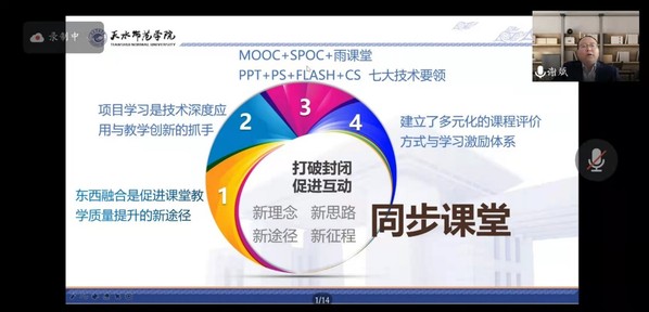 天水师范学院主讲教师谢斌作《基于<信息化教学设计与实践>观摩课教学方法研讨》主题报告。他介绍了学校情况、课程、同步课堂及思考几方面的情况。他表示,依托雨课堂“克隆班”开展的同步课堂要实现四个转变:从技术灌输到自主学习,从技术模仿到创新应用,从个体学习向团队协作,从共性学习向个性发展。