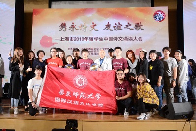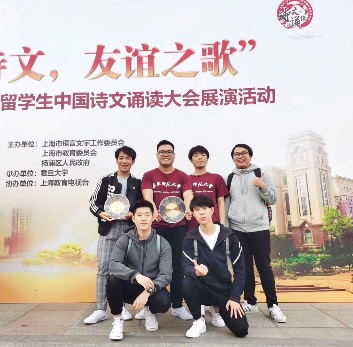 在11月10日下午结束的“隽永诗文,友谊之歌”——上海市2019年留学生中国诗文诵读大会展演活动中,我校泰国留学生朱杰龙、陈佳迪、蔡小彬、王培桂、胡寿强团体诵读作品《生如胡杨》、泰国留学生蔡小彬个人诵读作品《临江仙》,以展演活动团体和个人最高分成绩斩获2项最佳人气奖(全场3项最佳人气奖),展示了华东师范大学留学生风采,为学校争得了荣誉。