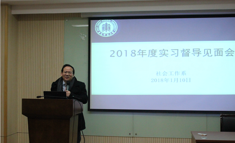 2018年1月10日上午,华东师范大学社会发展学院社会工作系2018年度专业实习动员会暨督导见面会在法商北楼一楼报告厅举行。社会发展学院院长文军教授、副院长兼社会工作系主任黄晨熹教授、韩晓燕教授、社会工作系副系主任何姗姗博士和吴同博士、李希希博士、社会工作系专业实习督导郭娟老师、来自不同机构的实习督导、2015级本科生和2017级全日制研究生约百余人参加了本次会议。会议以促进新一年度社会工作专业实习开展和提升社会工作专业实务教学质量为目标,设为师生交流会和督导研讨会上下半场。