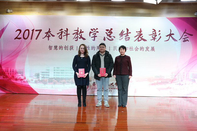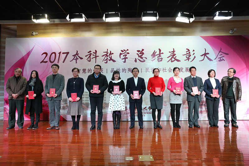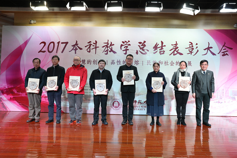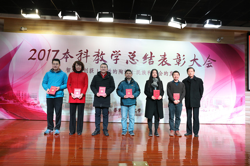 教学贡献奖和本科教学年度贡献奖是学校全新教学荣誉体系的核心组成部分。大会表彰了我校迄今为止设立的本科教学最高荣誉——华东师范大学教学贡献奖的获奖教师。2017年,外语学院高宁荣获杰出教学贡献奖,生态与环境科学学院王希华、对外汉语学院叶军、中国语言文学系吕志峰、数学系任韩、经济与管理学部吴述金、生命科学学院赵云龙、美术学院钱初熹荣获优秀教学贡献奖。校党委书记童世骏为获奖教师颁发了寓意“十年育树,百年育人”的树化玉奖牌。