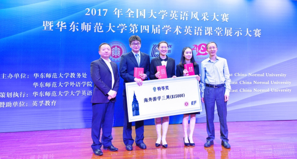 所有小组完成展示后,评委打分决出了本次比赛的奖项。其中特等奖一组,由来自我校的李赫明、罗欣雨和孙浩峰三位同学夺得,英孚学术合作部全国总监卢江先生为他们颁发了由英孚教育赞助提供、价值15000美金、为期三周的美国海外游学大奖。