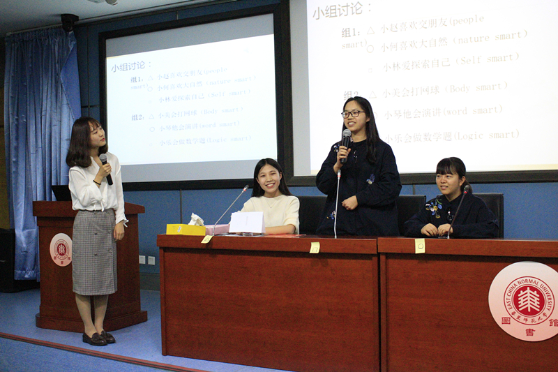 在课堂篇,汉语言文学专业的尹慧枝同学以UBC项目第一课“place-based education”(基于本地资源的教育)为切入点,从课堂活动、课堂学习收获及在教学中的运用三个角度,分享了这一理念对学习教育理论和开展教育实践的启发意义,“place-based education”关注挖掘并利用富有教育意义的本地资源,通过教学建立起学生和土地的联系,进而产生一种归属感与身份认同感。作为课堂的组成部分,小组合作是开展教学的重要形式。来自数学与应用数学专业的赵旖旎等七名同学以生动幽默的情景剧,再现了UBC课堂上讲授的小组合作模式,分享了如何运用多元智能等理论指导教学,并进行合理分组,让不同特点、不同层次的学生能够各尽其责、各尽其长,提升课堂教学效果,达到合作学习的目标。