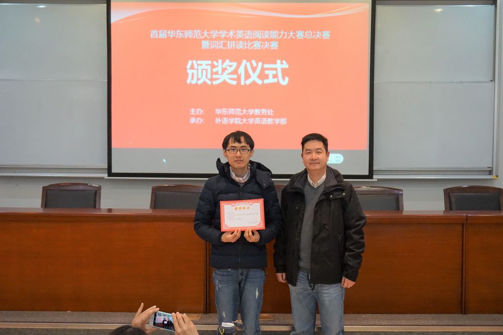 2016年12月28日下午,由华东师范大学教务处主办、外语学院大学英语教学部承办的我校首届学术英语阅读能力大赛总决赛在闵行校区4教106教室举行,大赛邀请多位专业老师担任评委。外语学院副院长朱晓映教授、大学英语教学部主任严文庆老师、副主任陈家刚老师、教务处林德龙老师等出席本次大赛总决赛。
