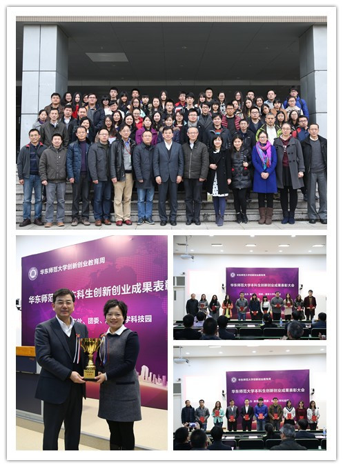 会议先后表彰了2015年度本科生创新创业优秀项目、2015年度本科生创新创业学术论坛最佳报告、首届华东师范大学创新创业大赛优秀项目、“挑战杯”全国大学生课外学术科技作品竞赛获奖项目、第23届大夏杯优秀组织奖及2015年度本科生创新创业项目优秀指导教师。副校长郭为禄向获奖师生表示祝贺,他认为表彰大会是营造学校创新创业教育氛围的形式之一,学生的获奖是师生辛勤付出的积累过程,表彰大会是演绎“爱在华师大”内涵中“对学生的爱”的重要形式;对双创工作的支持力度要加强,注意管理机制的进一步创新,同时注意加强引导学生跨专业合作。最后,他勉励与会师生,“创新创业教育周”活动是学校创新创业教育改革迈出的坚实一步,学校各部门必将联动起来,围绕“推动创新创业教育改革”这一个核心目标,群策群力,共创师大创新创业教育的美好明天。只要全校师生共同努力,必将走出一条充满华东师大特色的创新创业教育改革之路。