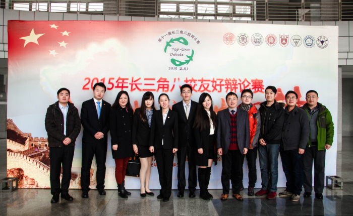 长三角八校友好辩论赛由长三角地区985高校组队参赛,本届比赛复旦大学、上海交通大学、华东师范大学、浙江大学、南京大学、同济大学、中国科学技术大学和东南大学分别组队参战,本届辩论赛主题为“ 青春、担当与中国梦 ”,由浙江大学承办,在浙江大学紫金港校区举行。本次辩论队由社会发展学院蔡迎春雪、教育学部陈新阳、经管学部李东阳和符昱、法律系刘艺和地球科学学部张彦队员等六位本科生组成,吴刚和王元力担任指导老师、余佳担任评委,教务处朱捷和徐世猛带队前往。