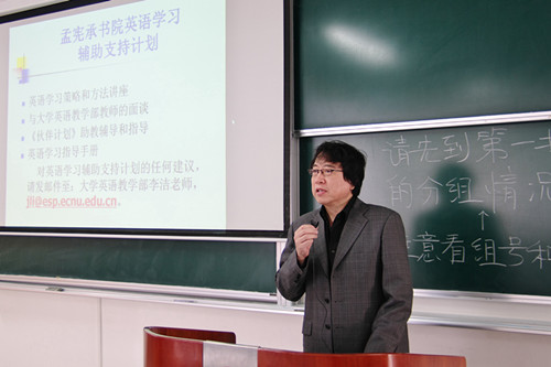 我校大学英语教学改革全面铺开已经一年有余,我们注意到少部分来自中西部地区的师孟宪承书院同学反映课程内容具有挑战性,授课形式前卫,他们难以跟上课程进度等问题。师范教育是我校高等教育的特色,英语教育又是其中重要一环,有鉴于此,大学英语部恳谈室特别推出面向孟宪承书院同学的“英语学习辅助计划”,旨在开展系列英语辅助、支持活动,希望能够以此促进他们的英语学习。该计划主要包括四个部分:大学英语教学部优秀教师关于英语学习策略和方法的系列讲座(8场)、与大学英语教学部教师的面谈、优秀助教参与的《伙伴计划》和发放恳谈室自编的英语学习指导手册。