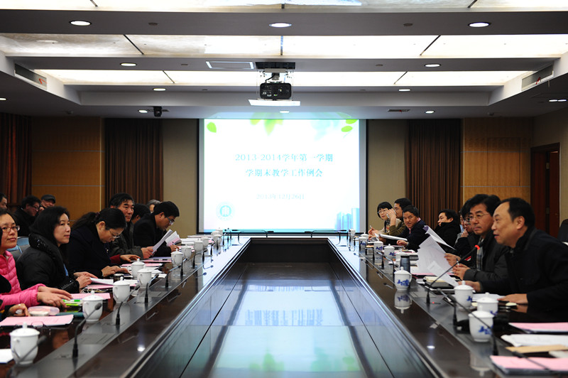 2013-2014学年第一学期学期末本科教学工作例会于12月26日在闵行校区办公楼403会议室召开。副校长郭为禄、招生办公室主任熊斌、院系分管教学院长(系主任)、以及教务处相关人员等40余人出席会议。会议由教务处处长戴立益主持。